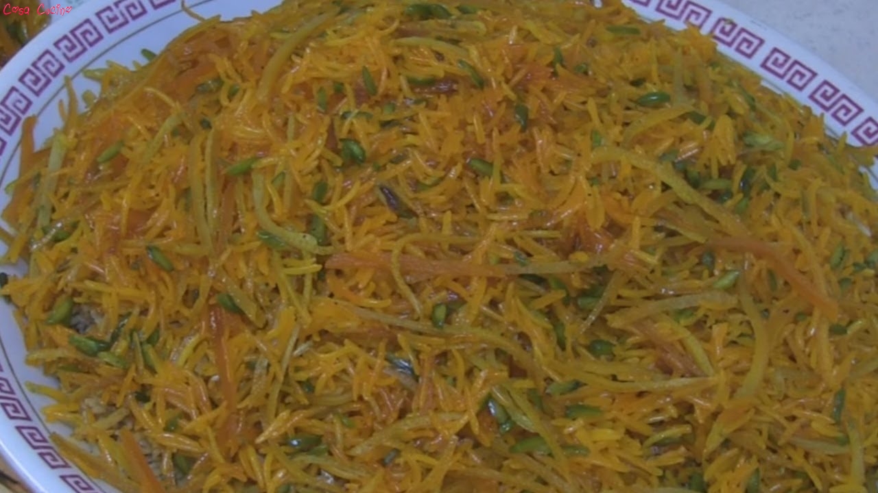 Soffriggete le mandorle nell'olio e mettetele da parte. Fate lo stesso con la cipolla. Fate rosolare il pollo, aggiungete lo zafferano e il brodo, lasciate cuocere per 20 minuti. A parte lessateil riso in abbondante acqua salata. Ancora a parte, preparate uno sciroppo sciogliendo lo zucchero nell'acqua, aggiungendo la scorza d'arancia grattugiata e facendo bollire finche non si addensa. Preparate il riso su un piatto da portata, disponeteci sopra i filetti di pollo, cospargete con la cipolla e le mandorle, bagnate col sugo di cottura del pollo e infine cospargetelo con lo sciroppo.