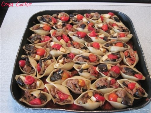 Scolate i conchiglioni facendo attenzione a non romperli, riempiteli con l'impasto ottenuto e disponeteli su una pirofila oliata.